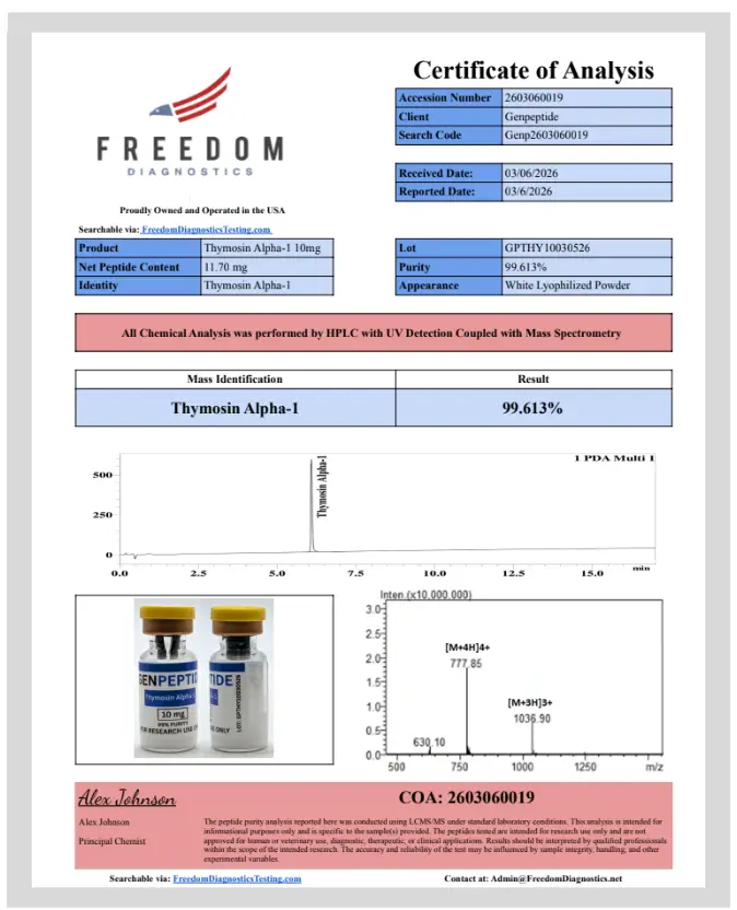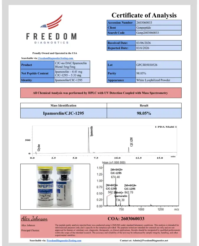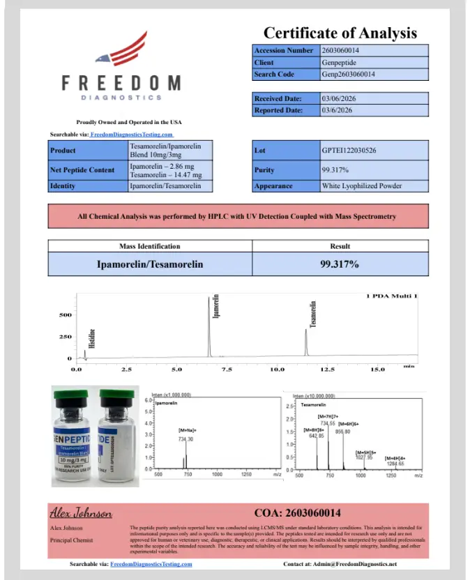 Every peptide we offer meets a guaranteed 99% purity standard. Purity is verified through independent third-party testing conducted by Freedom Diagnostics.