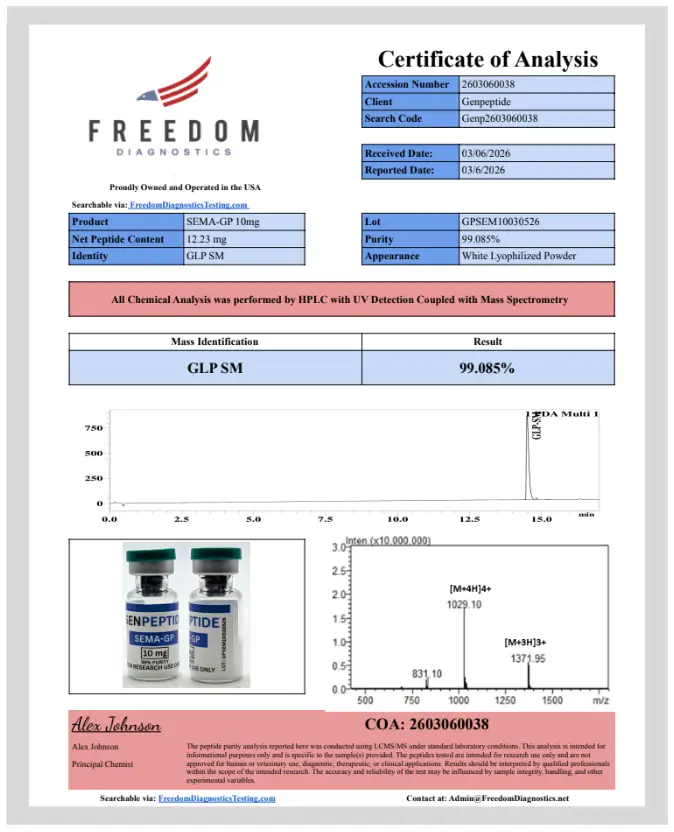 Sema-GP is a synthetic research peptide supplied as a lyophilized powder and intended for in vitro laboratory research use only. Not for human use, veterinary use, therapeutic use, diagnostic use, or clinical application.